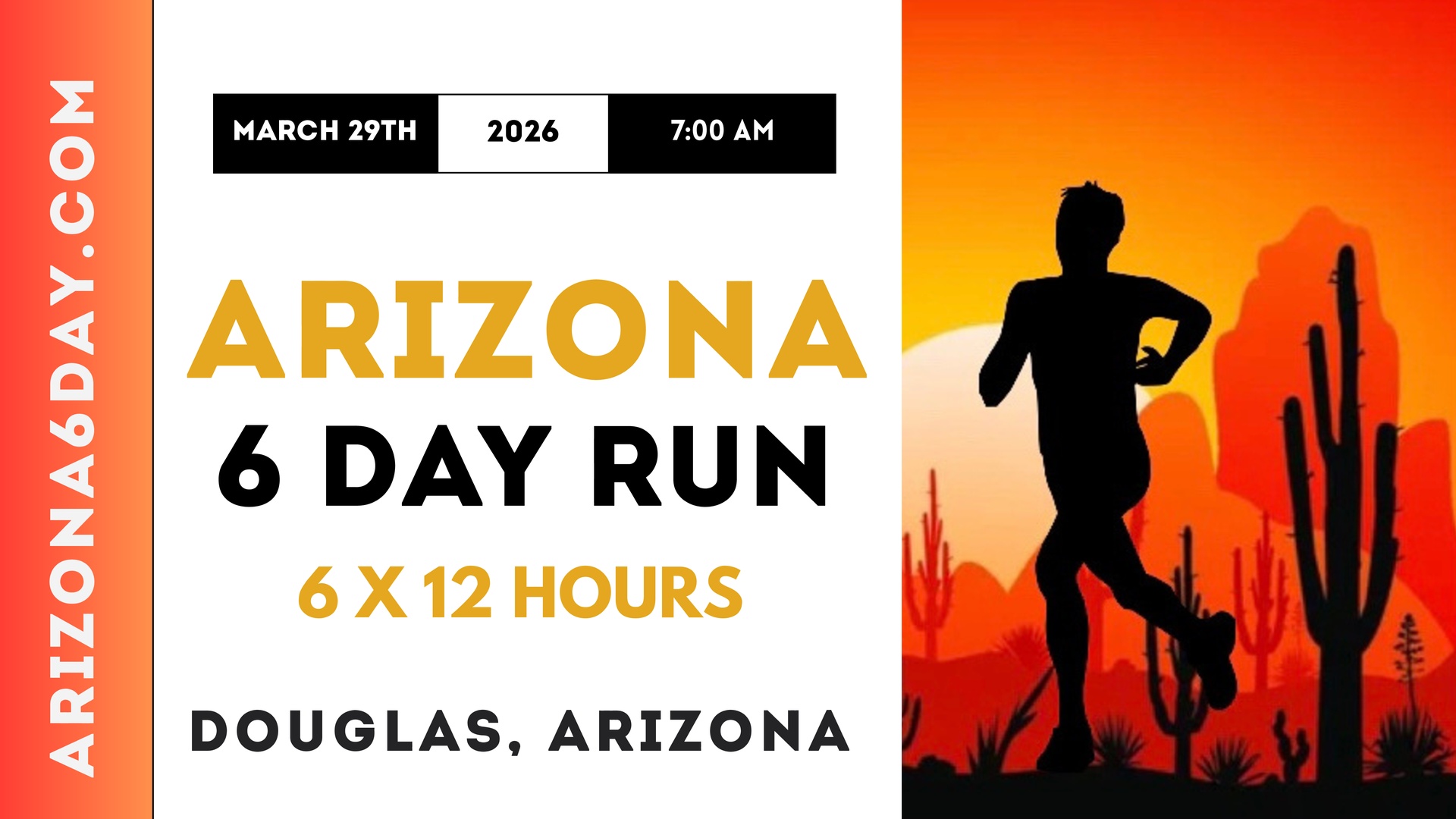 Runner at the Arizona 6 Day Run finish with trophies in the foreground.